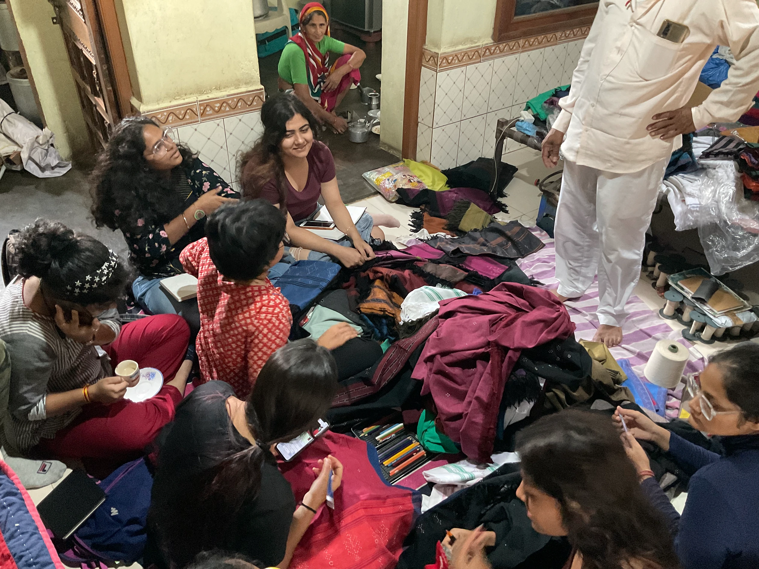 In Surendranagar in Gujarat, the students had their first hand-on experience with Tangaliya weaving by Mukeshbhai Makwana. Tangaliya weaving, also known as Dana weaving is practised by Dangasia community in Gujarat. Tiny dots of extra weft are twisted around a number of warp threads, giving an effect of bead embroidery to the fabric.
