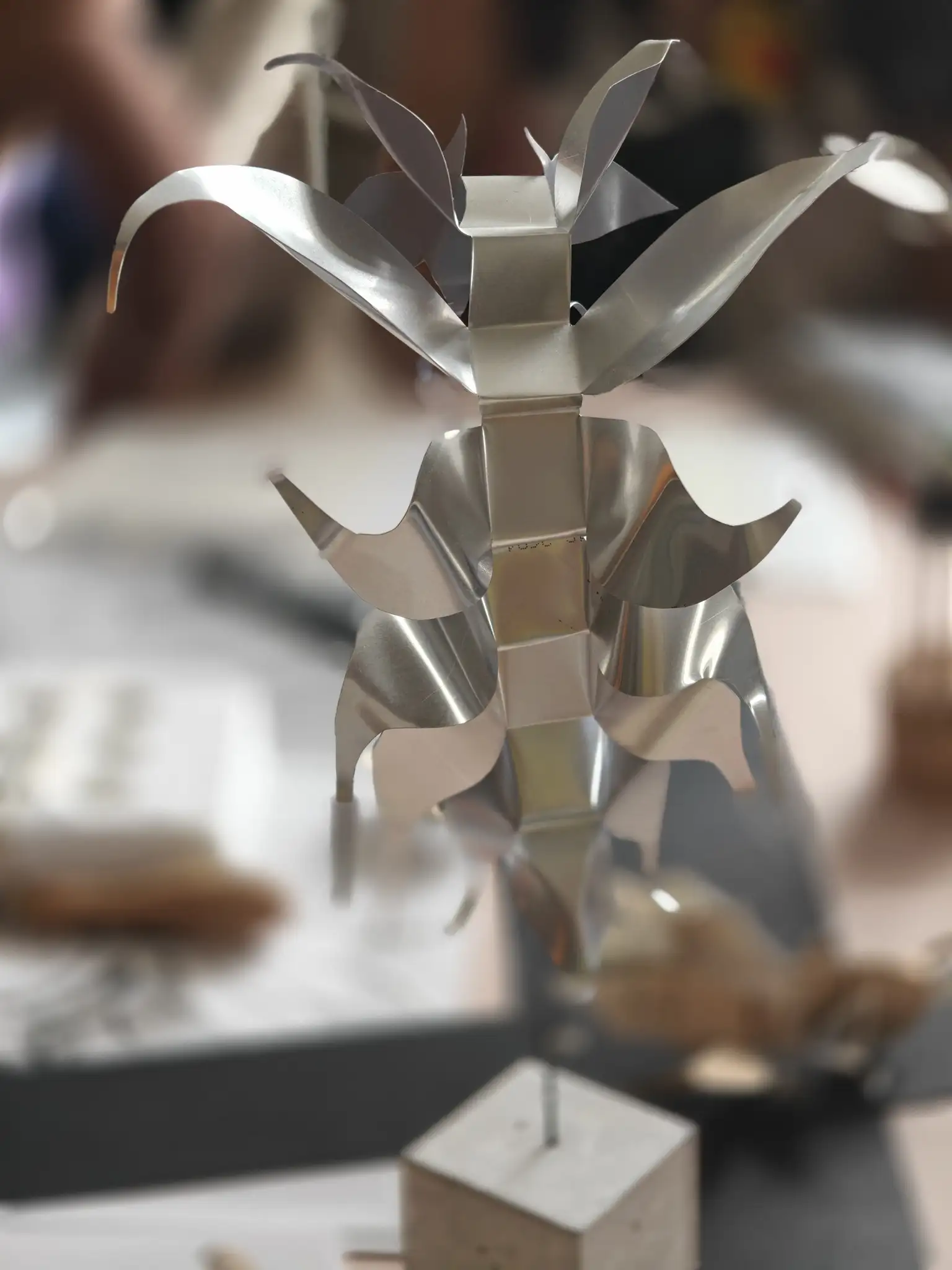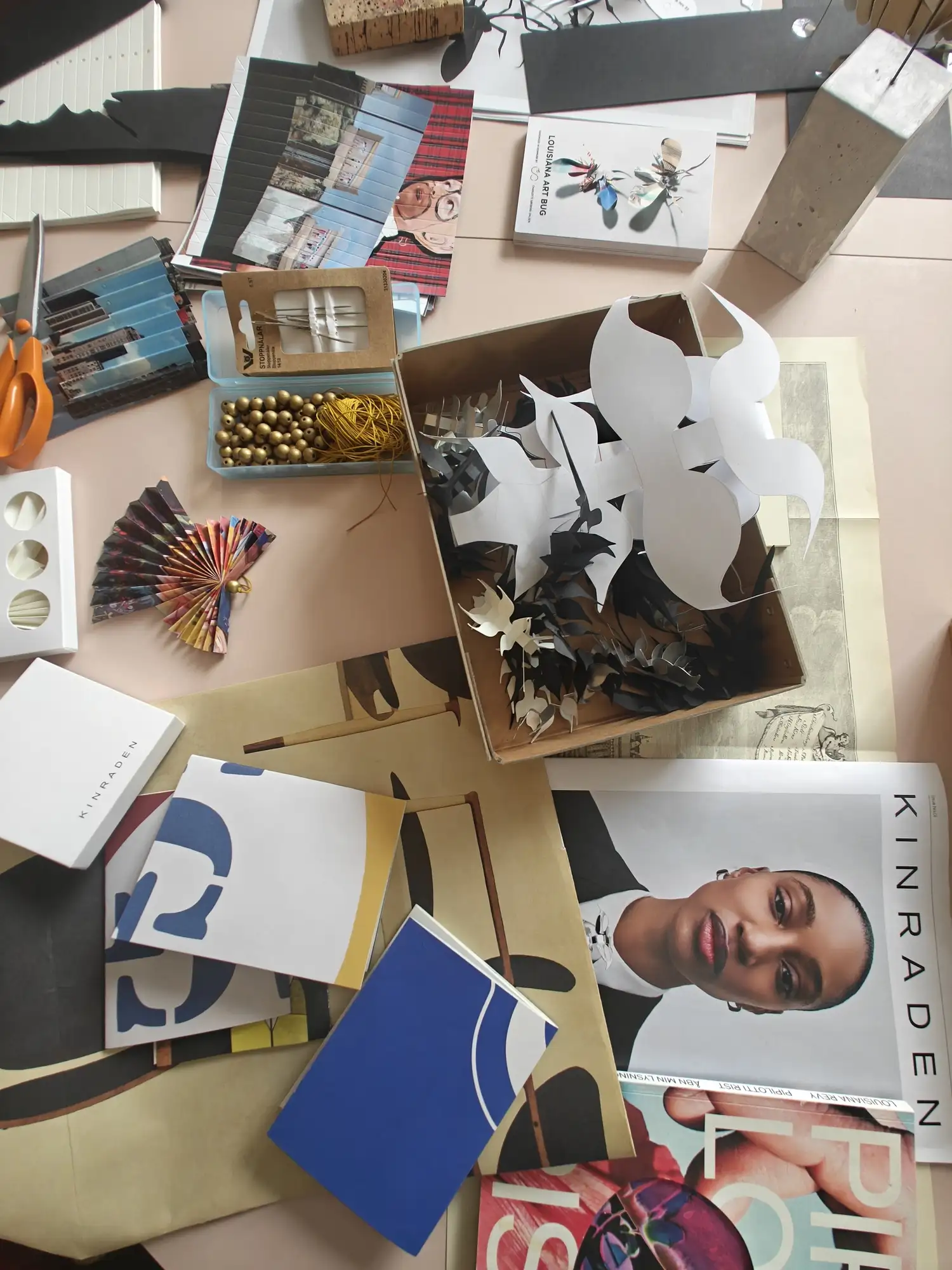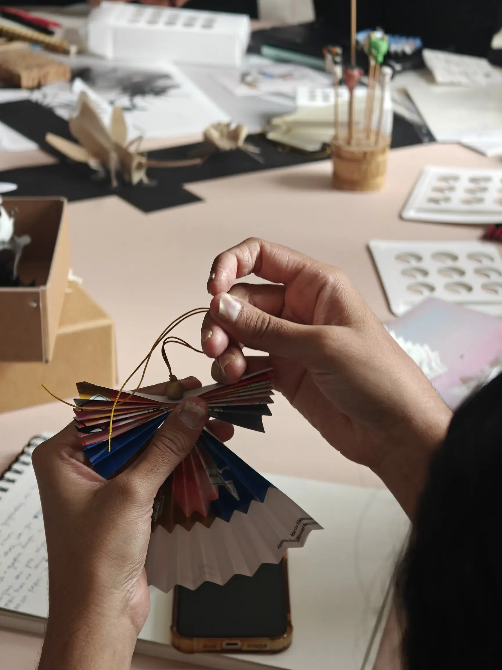 Charlotte Søeborg Ohlsen creates delicate, intricate paper‑folded angels and insects from repurposed posters and archival paper, blending craftsmanship with sustainability.
