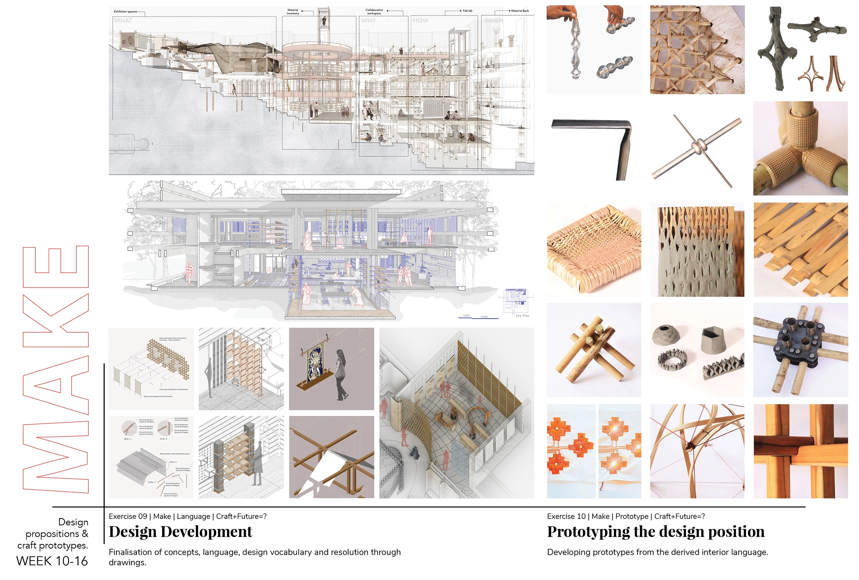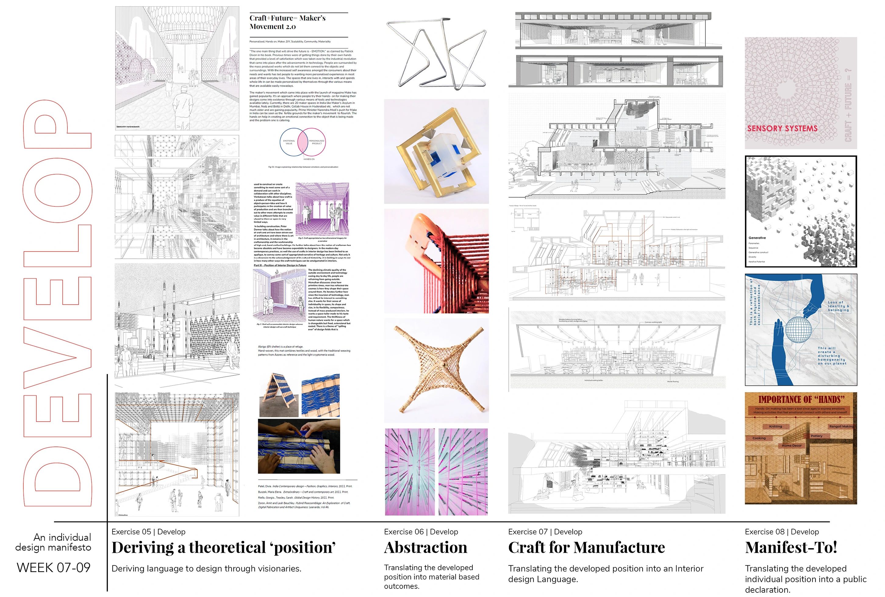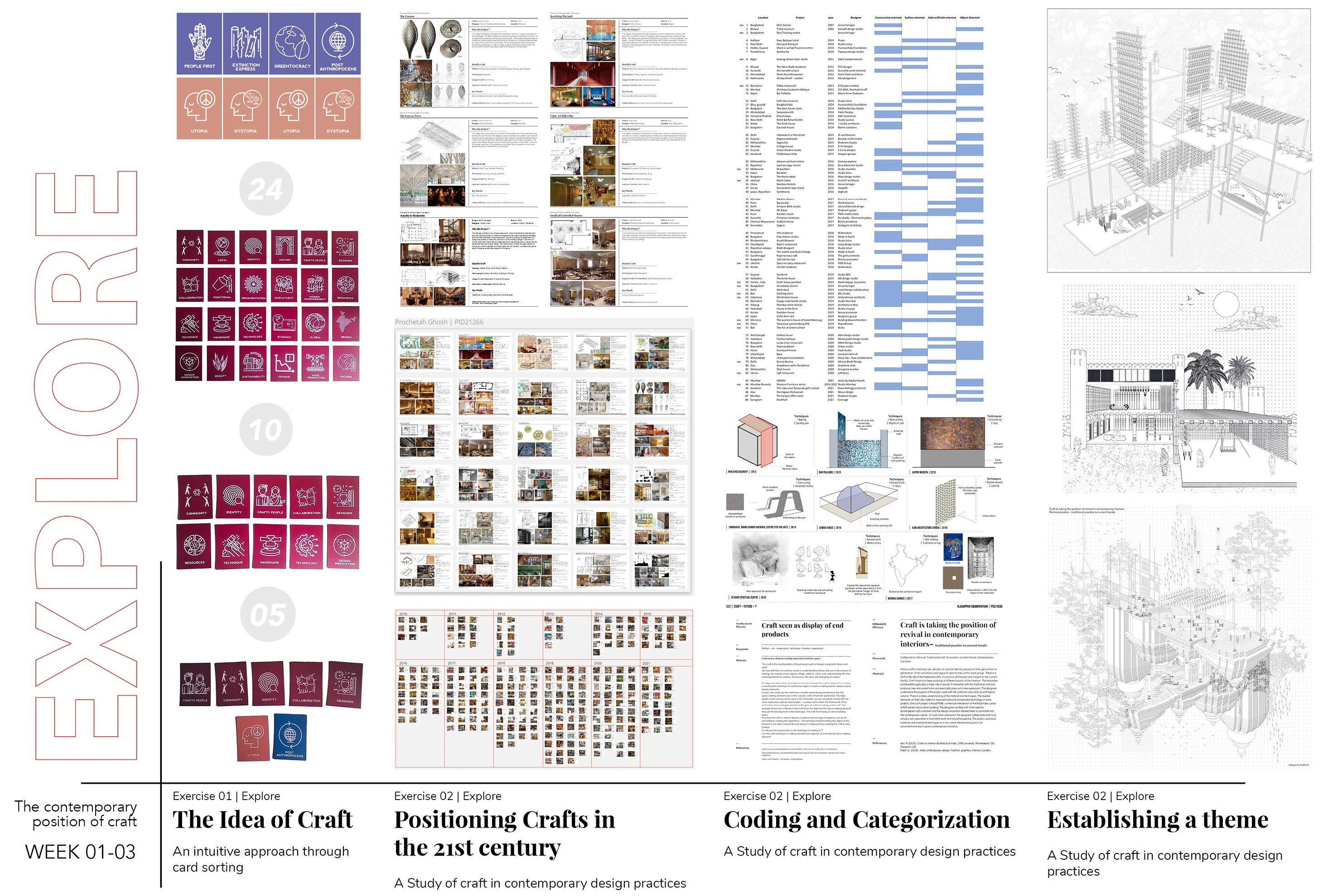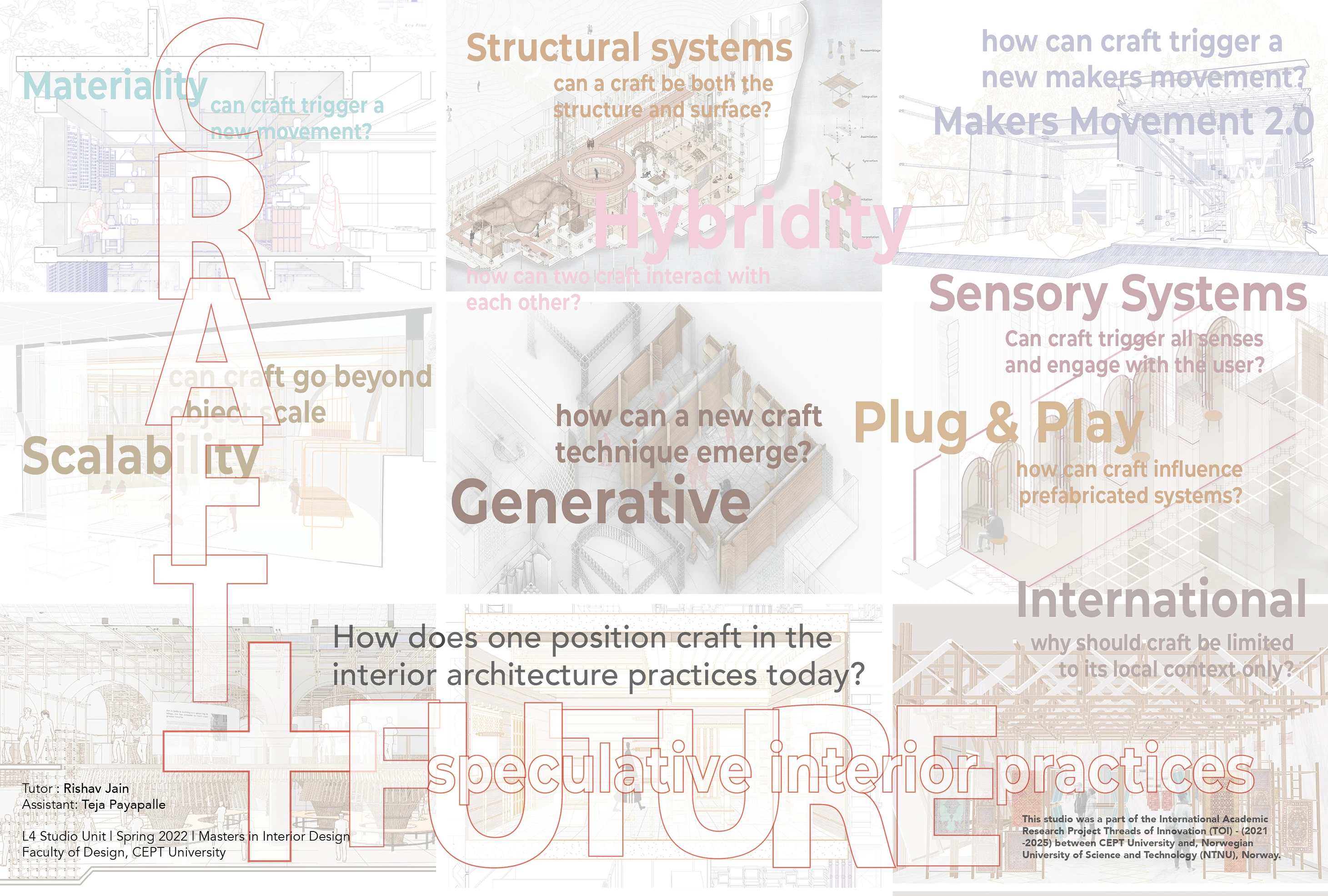The studio intends to discuss and identify the position of craft in contemporary interior architecture practices. With a combination of research and design processes, each student through their individual design manifesto challenges their preconceived notions, establishing craft as a forerunner of interior design decision making in the future. Through structured design explorations, together the works respond to the central question: what position will craft have in interior architecture practices in the future? The studio intends at cultivating and strengthening interior design decision making abilities for a given socio- cultural context. It also aims to sensitize students toward concerns of the global world, endowing with the spirit of tolerance towards pluralism in interior design practices of India. The studio is largely divided into four modules, emphasizing the learning outcomes of the course: KNOW the contemporary position of craft, IDEATE possibilities about the vision of the future, DEVELOP an individual design position for its future and MAKE design propositions representing the vision of future of craft.