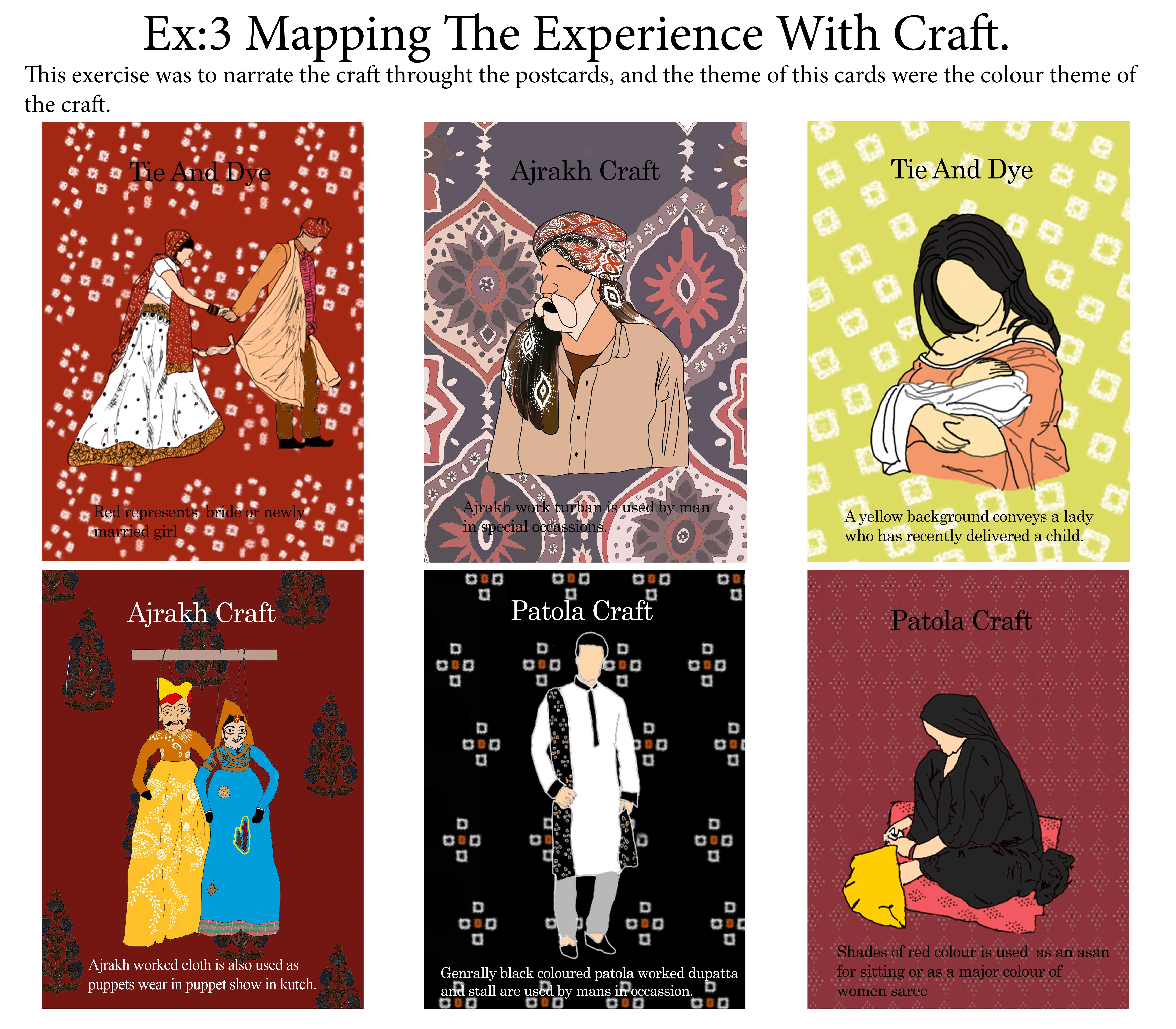 Mapping the experience of craft was all about learning the craft of kutch which includes the uses of colours in the craft depicted in the form of postcards.