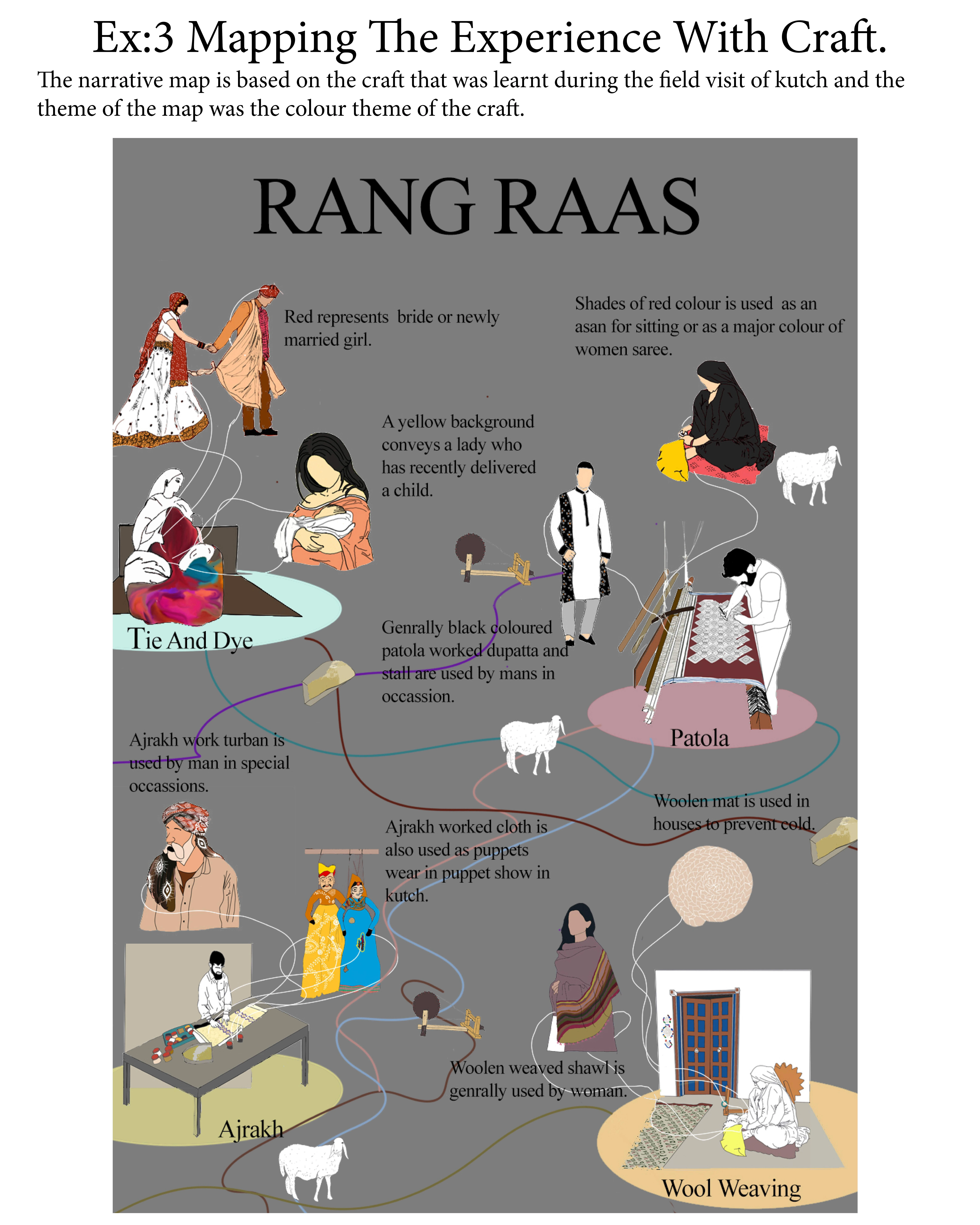 Mapping the experience of craft was all about learning crafts of kutch and depict it in a narrative map. The narrative map was made on the basis of the colour theme of the craft in A2 size.
