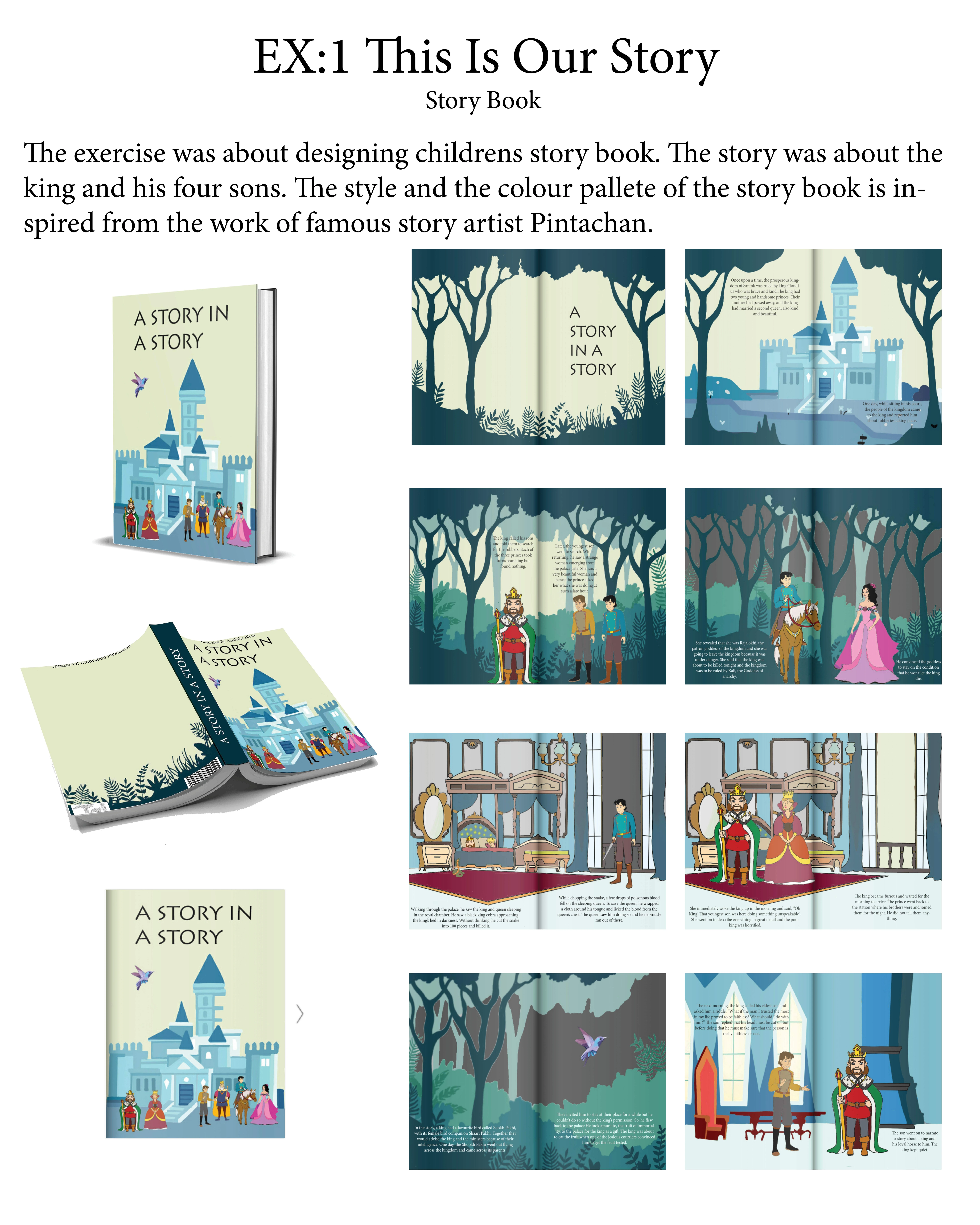 A story book was designed for children's of age 7 to 12 years. The story was about the king of the kingdom Santok and his three sons . The story name was "A story in a story" which was about telling the truth. As per the name story includes three sub stories in it.