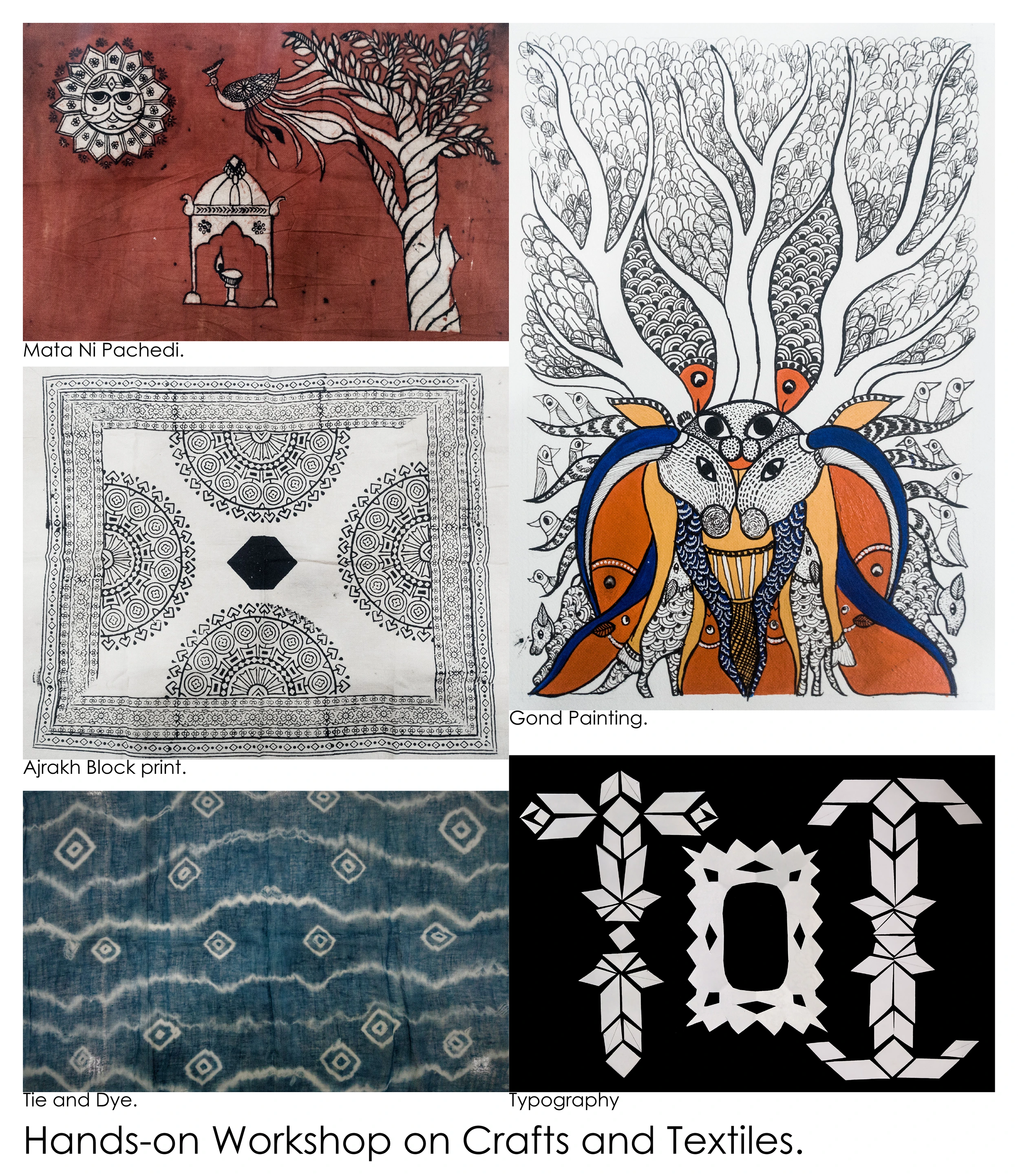 hand on workshop on mata ni pachedi, typography, ajrak block, gond painting.
