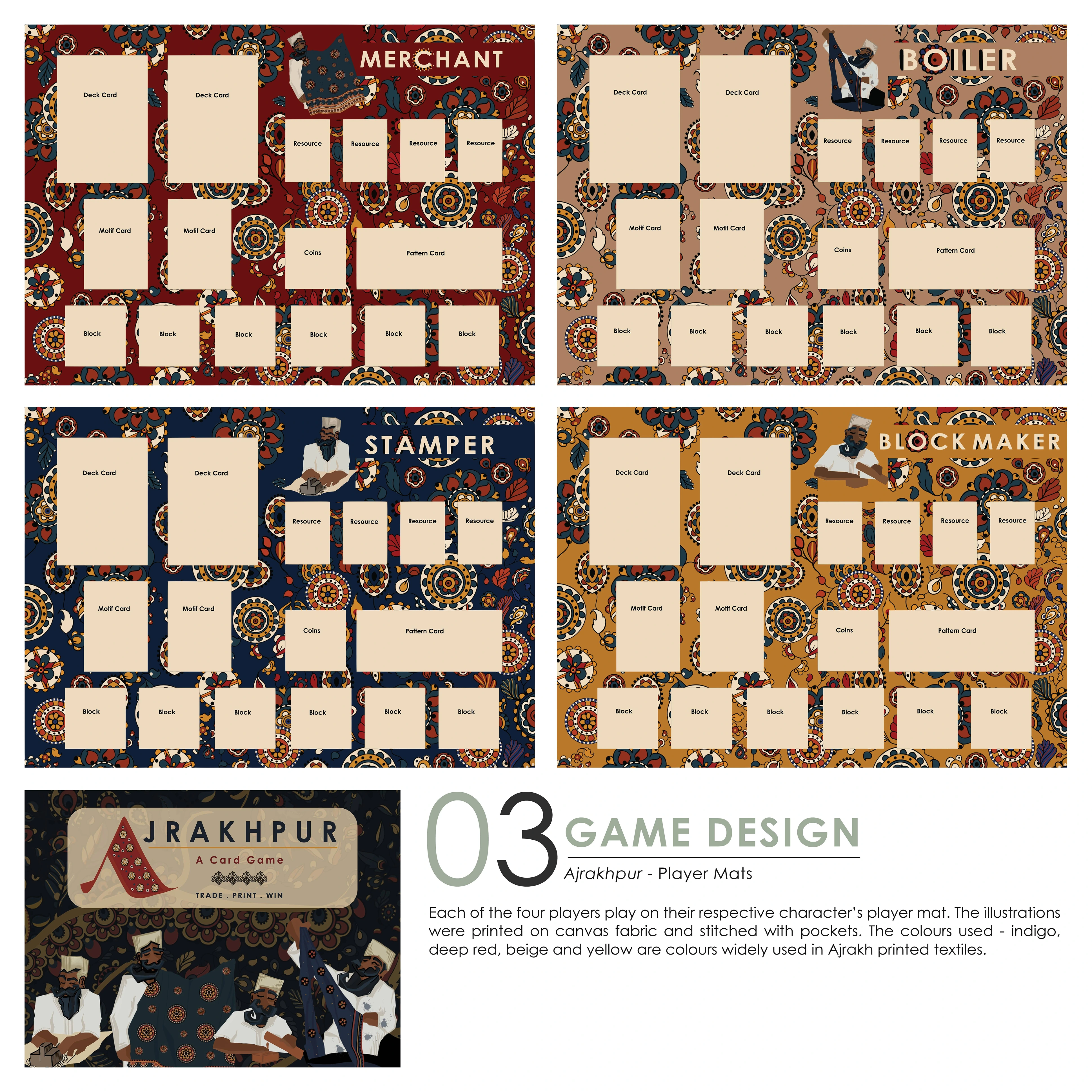 Player mats designed for the game 'Ajrakhpur'.