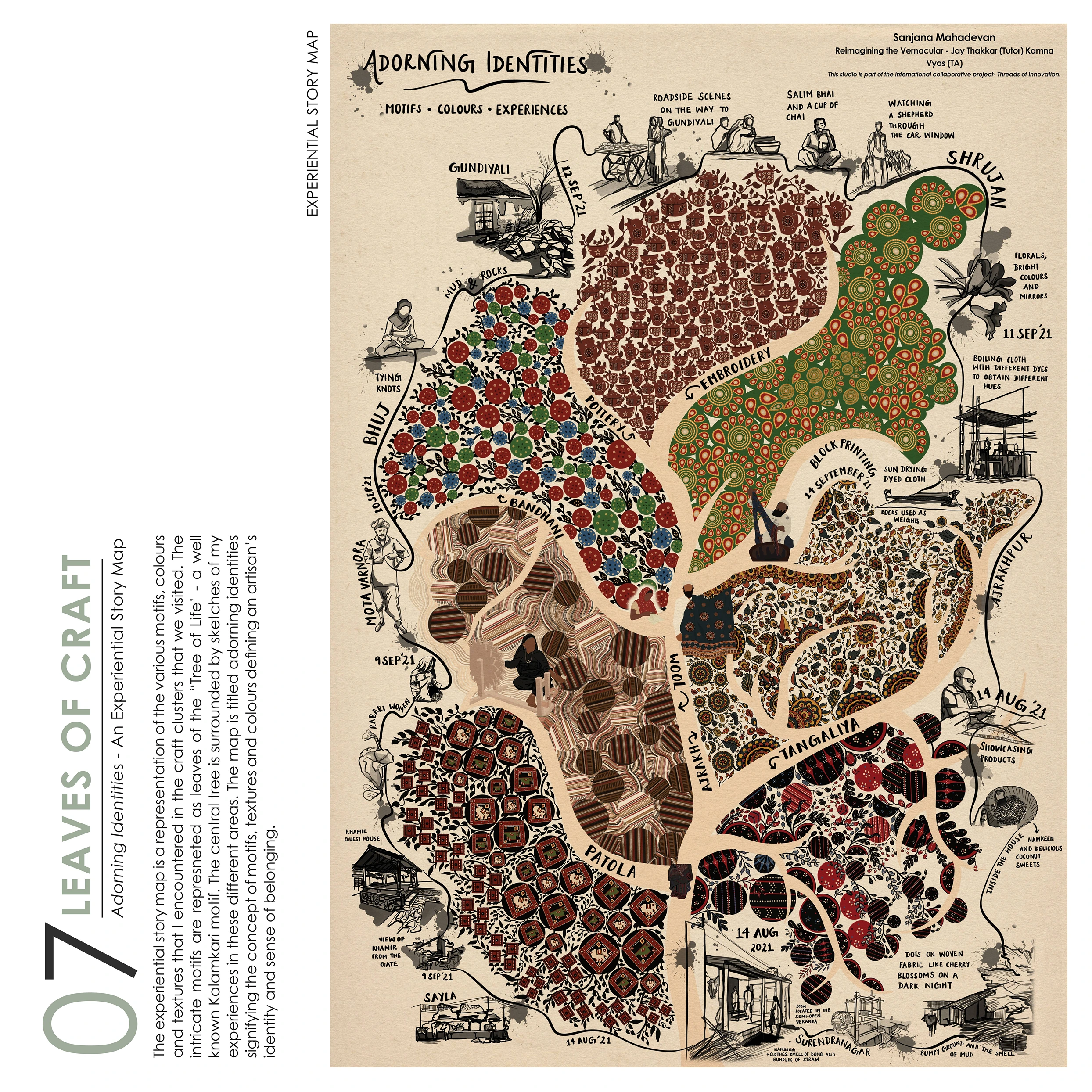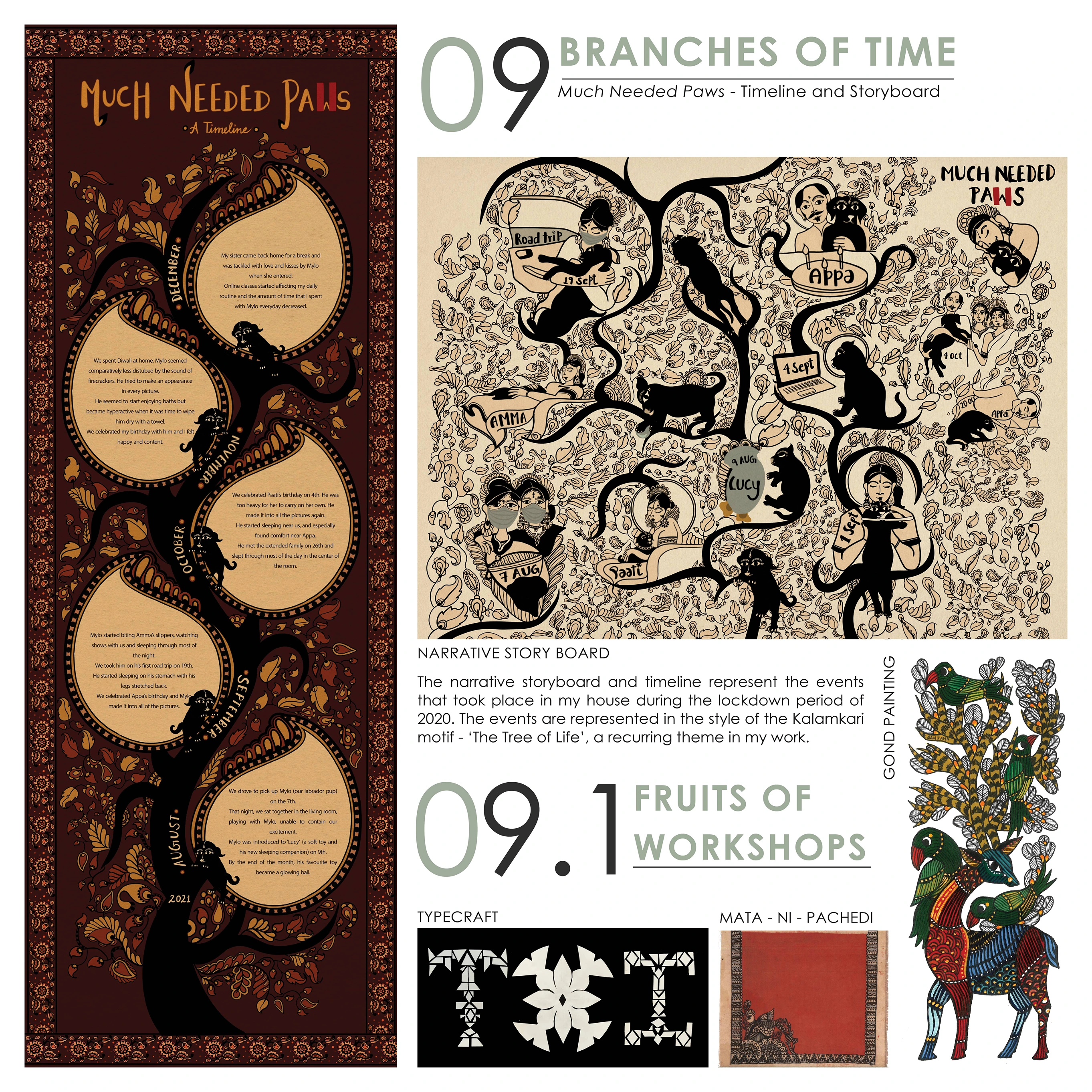 The tree of life - a widely used, intricate Kalamkari motif can be used to represent various concepts and is a recurring theme of representation in my work this semester. 'The Roots of Culture' - An illustrated storybook for children rooted to the cultural context of Chennai, 'The Branches of Time' - A timeline and storyboard depicting life in lockdown, 'The Leaves of Craft' - An experiential map and postcards that represent the clothing of craft communities and 'The Fruits of Workshops', all led to the final game design 'Ajrakhpur' - based on the motifs and processes in Ajrakh block printing.