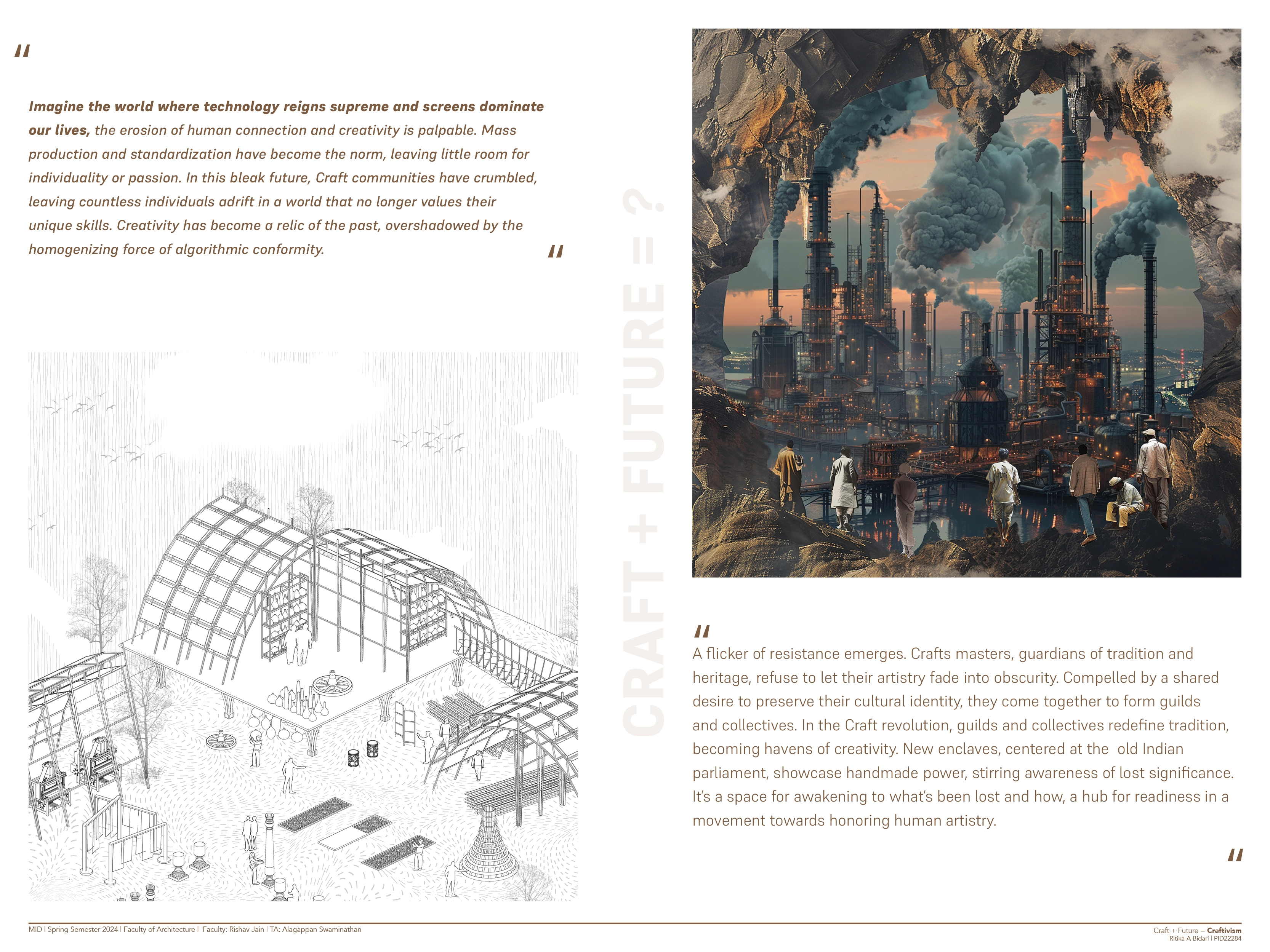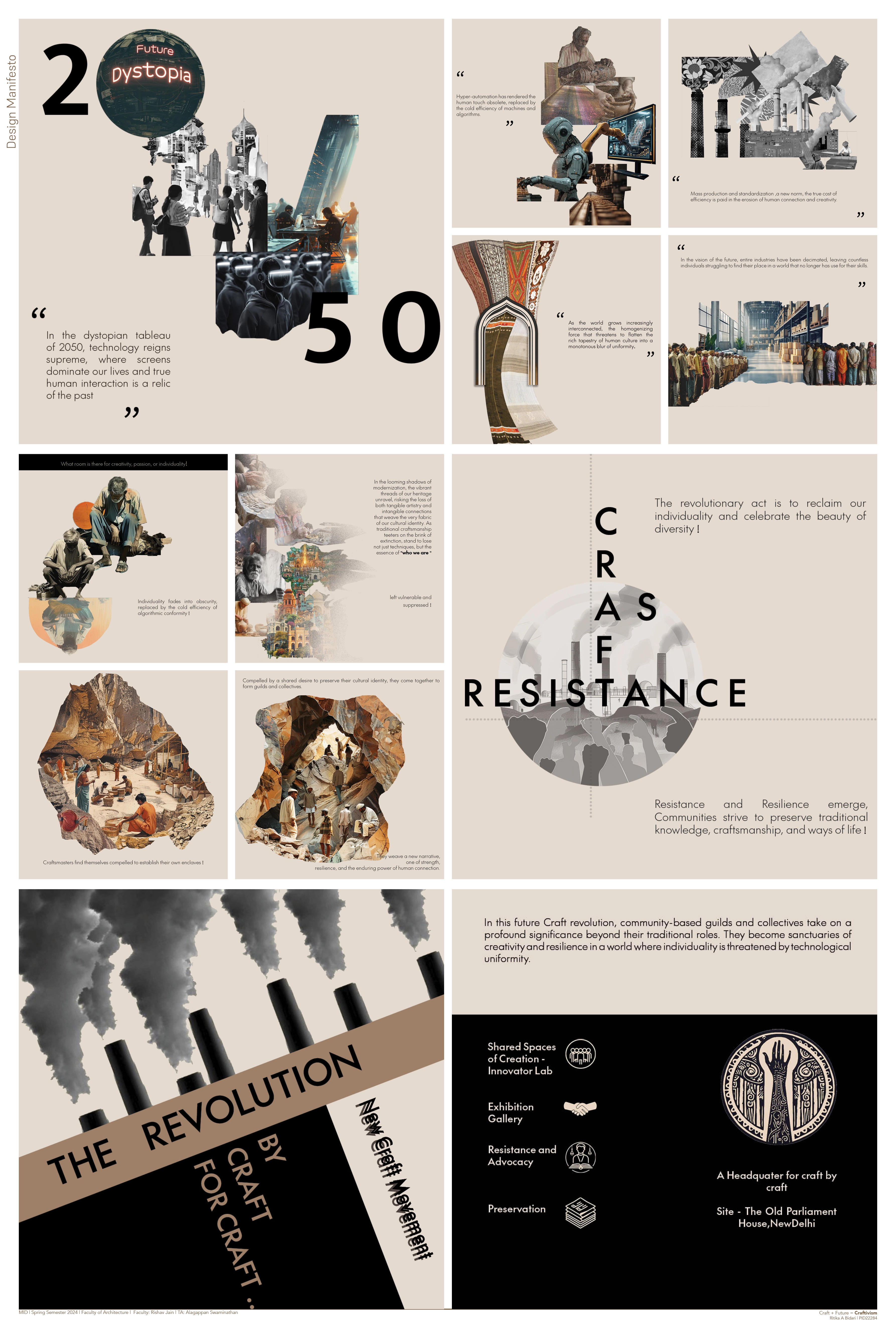 Imagine a world where technology reigns supreme and screens dominate our lives, the erosion of human connection and creativity is palpable. Mass production and standardization have become the norm, leaving little room for individuality or passion. In this bleak future, Craft communities have crumbled, leaving countless individuals adrift in a world that no longer values their unique skills. Creativity has become a relic of the past, overshadowed by the homogenizing force of algorithmic conformity. A flicker of resistance emerges. Craft masters, guardians of tradition and heritage, refuse to let their artistry fade into obscurity. Compelled by a shared desire to preserve their cultural identity, they come together to form guilds and collectives. In the Craft Revolution, guilds and collectives redefine tradition, becoming havens of creativity. New enclaves, centered at the old Indian parliament, showcase handmade power, stirring awareness of lost significance. It’s a space for awakening to what’s been lost and how a hub for readiness in a movement toward honoring human artistry.